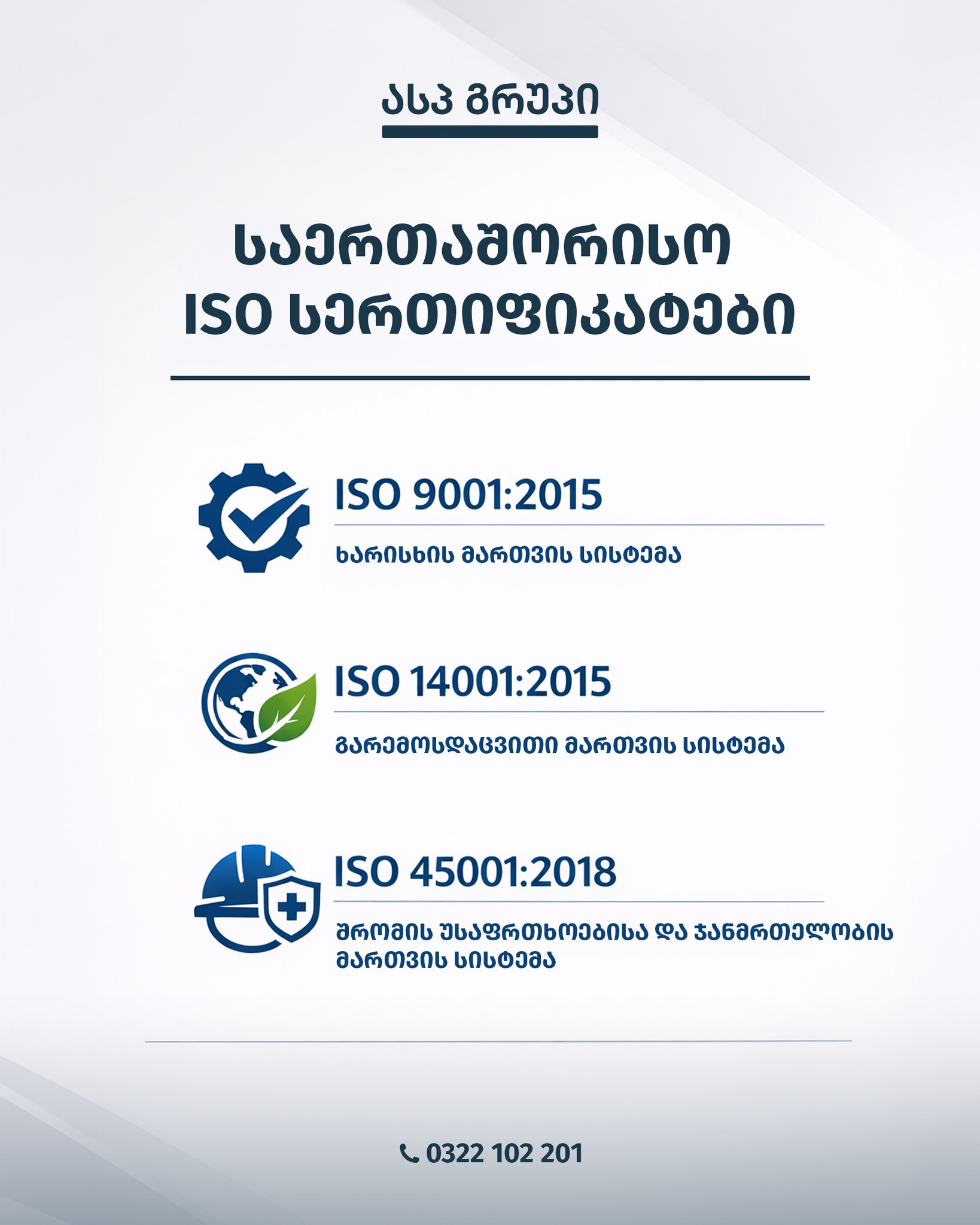 კომპანია ASP GROUP ფლობს ხარისხის მართვის, გარემოს დაცვისა და შრომის უსაფრთხოების საერთაშორისო სერტიფიკატებს: