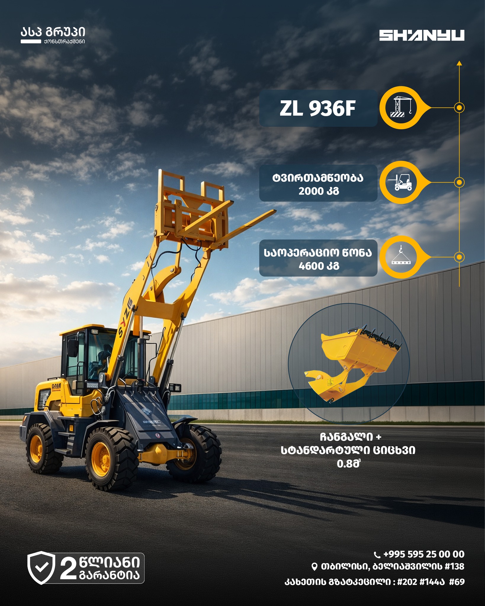 წარმოგიდგენთ SHANYU ZL 936F-ს — კომპაქტურ ძალას თქვენი საწყობისა თუ მშენებლობისთვის. მისი 4.6 ტონა საოპერაციო წონა და 2-ტონიანი ამწეობა იდეალურ ბალანსს ქმნის მანივრულობასა და სიმძლავრეს შორის.